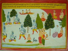 | Description / विवरण | Miniature painting based on Mahabharat - Vana parva. This painting depicts penance of Arjun king Janmejaya shown talking to Sanjay at the upper left. Janmejaya is telling about penance of Arjun. At the right part of painting, Arjun is shown performing penance in different pose to please Shiv in order to get Shakti. At the Upper Middle part. Devtas is depicted in Vayu yaan playing musical instrument. At the lower left, sages came to meet Shiv. |