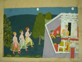 | Description / विवरण | Miniature painting depicting a king seated in a palace two man and a woman also depicted in the palace. Three man depicted outside the palace and they are coming towards the palace. It is an incomplete painting. |