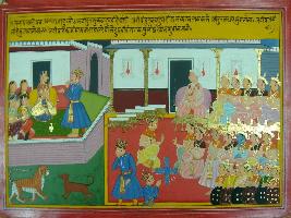 | Description / विवरण | Miniature painting based on Mahabharat - Sabha parva depicting Pandavas are playing chaupar with Duryodhan in court of Dhritrashtra. Pandavas lost everything in chaupar and Vidur is sent to Draupadi to give the news that Pandavas looses Draupadi. |