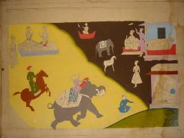 | Description / विवरण | An incomplete miniature painting of a king where the king is seen in different position like sitting position sleeping position it. While a horse and an elephant is seen in the painting. |