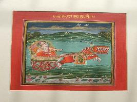 | Description / विवरण | Baruna form is shown. He is sitting two wheel rath. Seven horses is shown pulling the cart. Srikrishna is sitting in padmashana. |