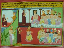 | Description / विवरण | Miniature painting based on Mahabharat - Sabha parva. The painting depicts Pandavas sitting in the Sabha after losing the chaupar game while Dushashana is bringing Draupadi by pulling her heir. |