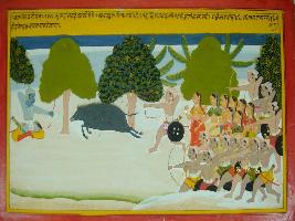| Description / विवरण | Miniature painting based on Mahabharat - Vana parva. It depicts Kirats is running after a bear. demon and Arjun also pointing his arrow towards the demon. |