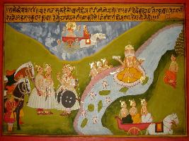 | Description / विवरण | Miniature painting based on Prithviraj Raso depicting Chandvardai talking to king Prithviraj and praising about his army at lower right. Ganga river is shown with Brahma sitting on lotus. To the left of Brahma, Parvati is shown sitting. At the lower left, three Demi gods are depicted riding on chariot. At the upper part sun god is depicted. |