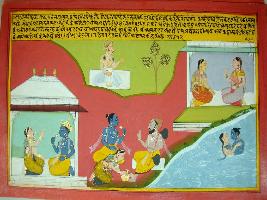 | Description / विवरण | Miniature painting based on Harivansha depicting lord Indra seated in front of Kalpa vriksh, right below Krishna seated with Satyabhama in the palatial balcony. She is telling him about the tree. In the other side, Satyabhama is cleaning the feet of Narad with water and Krishna seated beside her. Krishna and Satyabhama are bathing in river water in the lower left part. |