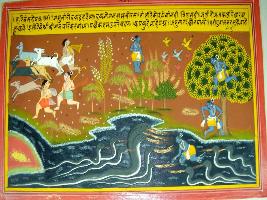 | Description / विवरण | Miniature painting based on Harivansha depicting the story of Kaliya Daman, and all Gawal Bal running in fear, with cows. It is an incomplete painting. |