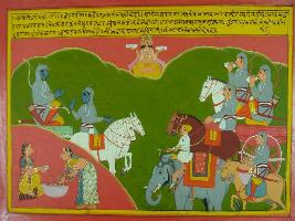 | Description / विवरण | Miniature painting based on Mahabharat - Ashwamegh parva depicting Saurath is depicted coming with his army, many peoples coming ahead playing conch and various musical instrument. Then Krishna told Arjun that you have killed his brother and he will now kill you, so pray Brahma. |