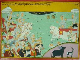 | Description / विवरण | Miniature painting based on Mahabharat - Shalya parva. The painting depicts a battle scene of Pandavas and Kauravas. The battle war so hot that meteors are following from heaven. |