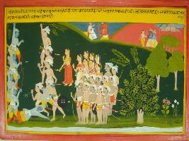 | Description / विवरण | Miniature painting based on Mahabharat - Vana parva. It is a war scene between Arjun and Kirtas, On the top a demon is depicted fighting with Indra. |