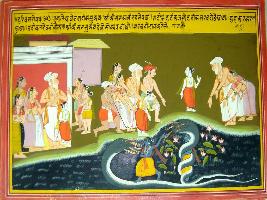 | Description / विवरण | Miniature painting based on Harivansha depicting the story of Kaliya daman . Krishna is depicted killing Nag Kaliya. People of Braj are standing Surrounding the pond. |