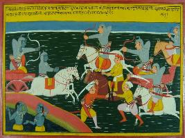 | Description / विवरण | Miniature painting based on Mahabharat - Ashwamegh parva depicting fierce fight between Arjun and Saurath, Arjun and Krishna depicted on chariot, Saurath then said if even Arjun and Krishna goes to pataal lok, he will not leave them. |
