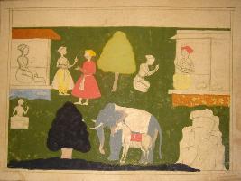 | Description / विवरण | An incomplete miniature painting of a king who is receiving a messenger while in the right side the king is seen and talking with a man. While in the lower part of the painting a horse and an elephant is depicted. |