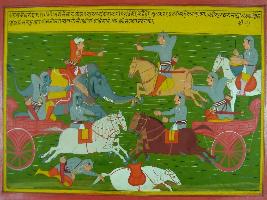 | Description / विवरण | Miniature painting based on Mahabharat - Ashwamegh parva depicting army of opposition asking Saurath to fight with them . The opposition army pierced him with arrows and he at last goes to Krishna. |
