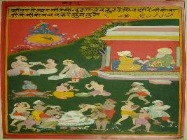 | Description / विवरण | Miniature painting depicting Akbar and Mullah-do-Piyaja sittting, and telling that one can have, as much as he likes from Anrakut and be happy. |