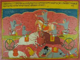 | Description / विवरण | Miniature painting based on Mahabharat - Ashwamegh parva depicting horse of Saurath suffered from arrow wounds. Then fierce fight happened, then after killing Saurath with arrows, Arjun turned back. |