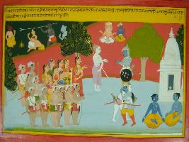 | Description / विवरण | Miniature painting based on Mahabharat - Vana parva. It is a meeting scene of Arjun and Shiv, many men and women are also depicted, two men are sitting in front of a Shiv temple. |