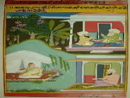 | Description / विवरण | Miniature painting based on Mullah-do-Piyaja. It depicts Mullah telling Akbar that many times a person project himself as a holy man but his mind is also distracted by seeing beautiful women. |