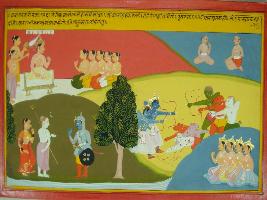 | Description / विवरण | Miniature painting based on Mahabharat - Vana parva. Five sages are depicted with a king, Arjun is depicted killing demons and also asking the Pasupat astra from the Shiv. |