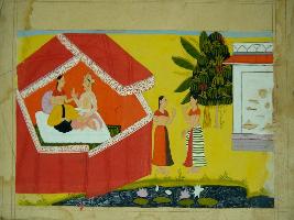 | Description / विवरण | Miniature painting depicting a king with his queen seated in a tent, two females are depicted standing outside, there is a pond near the tent. It is an incomplete painting. |