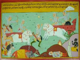 | Description / विवरण | Miniature painting based on Mahabharat - Shalya parva. The painting depicts Bhimsena come down from his chariot with a great energy. The painting comparing as Yam. |