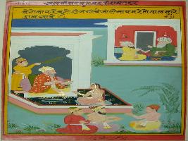 | Description / विवरण | Miniature painting based on Mullah-do-Piyaja depicting that son is waiting for his father so that he can get money. |