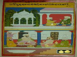 | Description / विवरण | Miniature painting depicting Akbar and Mullah-do-Piyaja talking and on the lower part a hindus is talking to a muslim is depicted and says its better to understand each other. |