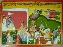 | Description / विवरण | Miniature painting based on Harivansha depicting Krishna sitting on couch and talking to Yadavs at the right part. To the left Krishna and Balram are shown leaving in their horses, with some Yadavs. At the top left, a woman is shown in a palanquin and behind her a Yadav Sardar is depicted sitting on elephant. |
