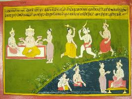 | Description / विवरण | Miniature painting based on Mahabharat - Udyam parva depicting one day Brahma and Indra is discussing about the fight of devas and demons and worried about the destruction of devakula. Then they called Dharma and ask him to catch the demon and handover him to Varun. Then Dharma caught the demon and handover it to Varun. |