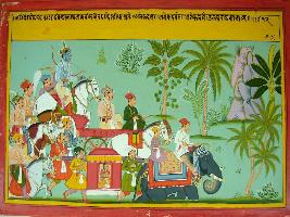 | Description / विवरण | Miniature painting based on Harivansha depicting Krishna, seated on horse, and other horsemen accompanying a woman in palanquin and a king on a chariot. |