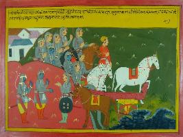 | Description / विवरण | Miniature painting based on Mahabharat - Ashwamegh parva depicting Krishna asking king to protect horse freed of Pandavas. Then all five warriors - Sadharaja, Pradyuman, Anusalva, Suvega and Arjun walked behind horse. |