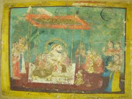 | Description / विवरण | Miniature painting depicting and Queen facing left and sitting on couch in a court. Queen carrying a son on his lap one boy is shown standing near them. Behind them, female attendants holding fan of peacock s feathers are depicted. At the left part, women are shown carrying plate of aarti and some plate. |