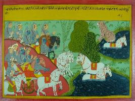 | Description / विवरण | Miniature painting based on Mahabharat - Ashwamegh parva depicting horse of Ashwamegh going to river and sat there. Behind him five warriors - Sadharaja, Pradyuman, Anusalva, Suvega and Arjun are shown walking. Then one tiger came near horse. |