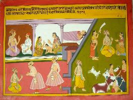 | Description / विवरण | Miniature painting based on Harivansha depicting two men talking with each other at the top right side, in the left, two women standing with a child, a woman sleeping with a child. Lower right part of painting depicts a seated sage with a king. On left part the sage is talking to a woman and also walking towards gopas depicted with cows. |