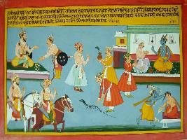 | Description / विवरण | Miniature painting based on Harivansha depicting a seated king with a standing man with weapons, below them two horse riders have been seen with bow and arrow. At the centre to the painting depict three persons with snake, while on the left upper side of the painting Krishna depicts seated with a person and below it Krishna is killing a demon. |
