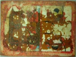 | Description / विवरण | In this a king is seated on a high throne and having wine the two guards can be seen below. Floral design on back. |
