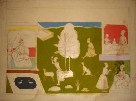 | Description / विवरण | Miniature painting depicting a man, coming to court of king with a dog at extreme right part. king is shown seated on throne with chori bearer standing beside him. At the middle part, a man u shown sitting nearby a dog is also shown. At the upper left, man is shown sitting with wife and son. Below this king is shown sitting with one noble standing in front of him. It is an incomplete painting. |