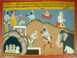 | Description / विवरण | Miniature painting based on Harivansha depicting some men with animal headed man in a cave in a lower right part. To their left, Arjun is shown giving blessing to his grand son Aniruddh. At the upper right part, Arjun is standing with Brahamadatta and performing a yagna. At the extreme upper left, one demon is shown. |