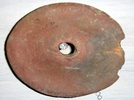 | Description / विवरण | Terracotta wheel with a perforation at centre. It is slightly raised near the perforation. The edge is partly broken. |