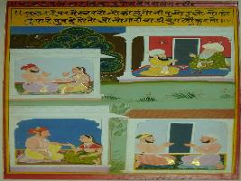 | Description / विवरण | Miniature painting depicting Akbar and Mullah-do-Piyaja talking. On the lower part two couples and two men are depicted talking. |