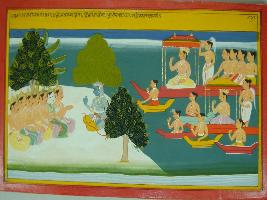 | Description / विवरण | Miniature painting based on Mahabharat - Vana parva. Arjun is depicted sitting with various nobles and kuber is depicted coming to him on his vimaan with many peoples. |