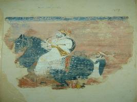| Description / विवरण | Portrait of the king riding the horse and facing right side. The attendants are following him. The king is wearing a white pyjama-kurta and red pagri. He is holding Katar in his right hand and Lagaam of horse in left. The horse is black in colour. |