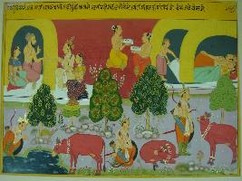 | Description / विवरण | Miniature painting based on Raghuvansha depicting a king and queen seated with a sage and then sleeping in the other part at the upper panel. A king and cow are drinking water together, sitting and standing in the lower panel. |