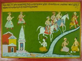 | Description / विवरण | Miniature painting based on Mahabharat - Ashwamegh parva depicting one can one get salvation by going to Kashi, by doing Pind dana , by doing yoga and by taking bath at Triveni. |