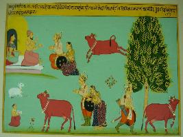 | Description / विवरण | Miniature painting based on Raghuvansha depicting seated king Sanku and his wife in front of a sage and his wife with folded hands. On its left Kamdhenu is depicted. Below it king and queen standing with folded hands before Kamdhenu, then king and the cow are walking away. |