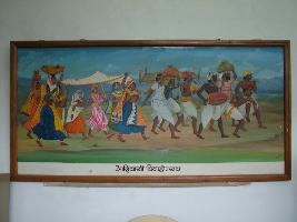 | Description / विवरण | It is a oil hard board painting of tribal marriage. Male figures are shown dancing and musical instrument in centre. Background is painted with blue colour. Colur used are white, green, red, yellow ochre, brown and pink. Its artist is Mohan Lal Sharma. |