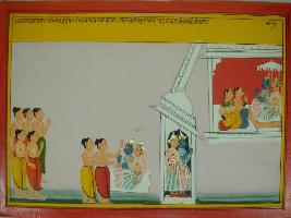 | Description / विवरण | Miniature painting based on Mahabharat - Vana parva. The painting shows that some Gandharvas are paying respect to Indra and Arjun and Indra took Arjun to his home. |