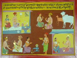 | Description / विवरण | Miniature painting based on Mahabharat - Udyam parva. It depicts Vidur talking to Dhritrashtra and telling him about how by long burning of Iron bad to formation of Bronze and in some way hard work leads to success. |