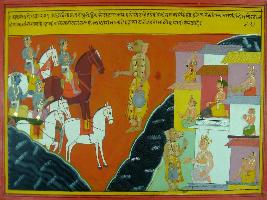 | Description / विवरण | Miniature painting based on Mahabharat - Ashwamegh parva depicting Arjun following horse of Ashwamegh and reaching near Lanka. He met Purohit of Vibhishan who is seen sent by Vibhishan. Purohit is wearing garland of human heads and carrying a kamandal. He has mouth of Varaha, temple of camel and ears of elephant. |