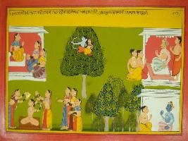 | Description / विवरण | Miniature painting based on Mahabharat - Vana parva depicting at the upper left Indra talking to Chitrasen and other Gansharvas. At the lower left Chitrasen and Arjun are in conversation. At the right side friends are helping Urvasi in her bath, and dressed her with ornaments so that she can attrack Arjun. |