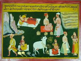 | Description / विवरण | Miniature painting based on Mahabharat - Udyam parva. It depicts importance of satmarg and as stones move fast from hills towards down in the some way company of bad women leads to fast downfall of morality. |